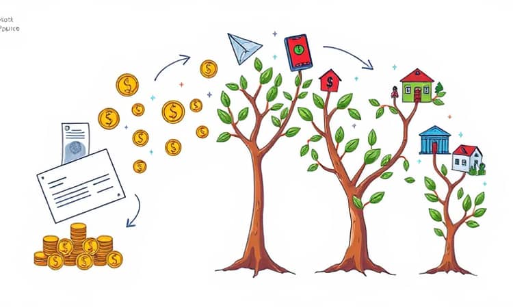 Imagine seu dinheiro como um rio que flui constantemente, começando como um simples salário e crescendo para se tornar um patrimônio robusto e sustentável.